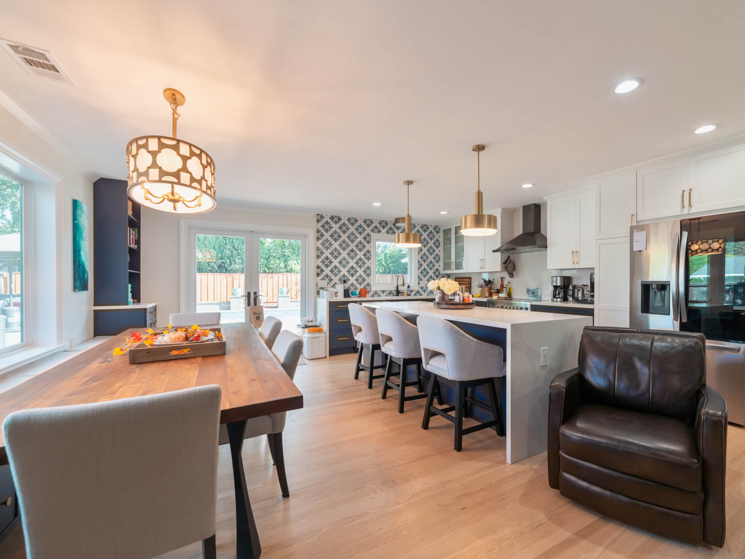 The open-concept kitchen now flows seamlessly into the dining and living areas, creating a bright and social atmosphere perfect for family gatherings and entertaining. Each room reflects a balance of bold design and timeless craftsmanship — blending style, comfort, and everyday functionality.